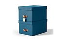 Set of two low 17-liter storage boxes made of stackable and durable cardboard, featuring a leather handle for easy handling. The boxes are suitable for A4-sized papers and other small items.