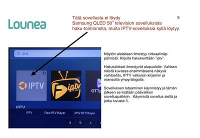 päivitykset okJos kyseistä IPTV sovellusta ei löydy sovelluskaupasta, sitä ei ole saatavilla televisioon.