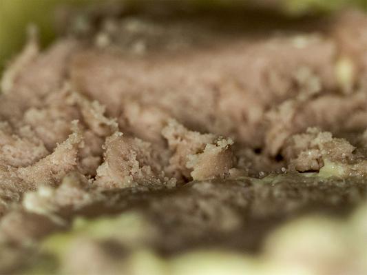 Liitänpä piruuttani makrokuvan leivän päälle vedellystä maksamakkarasta. Aika ällön näköistä laarditahnaa.