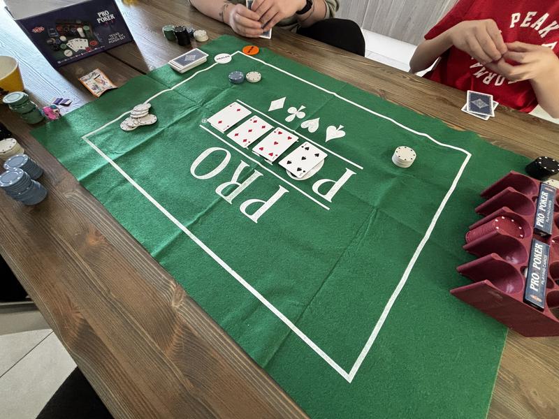 Halvin pokerisetti mitä löytyy. Kyllä tällä pääsee alkuun. Cut cardit puuttuvat kokonaan, muuten kaikki tarvittava kaikki löytyy. Huopa on taiteltuna sisällä ja taitosten suoristaminen vaatii paljon työtä. Itsellä yhdessä kortissa oli värivirhe selkäpuolella ja kortit myös alkoivat repeillä kun käytti sovellettua cutcardia. Eli kannattaa hankkia kunnon muovipakat ja heittää mukana tulevat pakat roskiin viimeistään kun alkaa tunnistaa kortteja selkäpuolelta. Pelimerkeissä on pientä sotkua korosteluissa eikä arvoja ole merkitty. Mutta niilläkin pärjää kun katsoo netistä jonkun väristandardin.