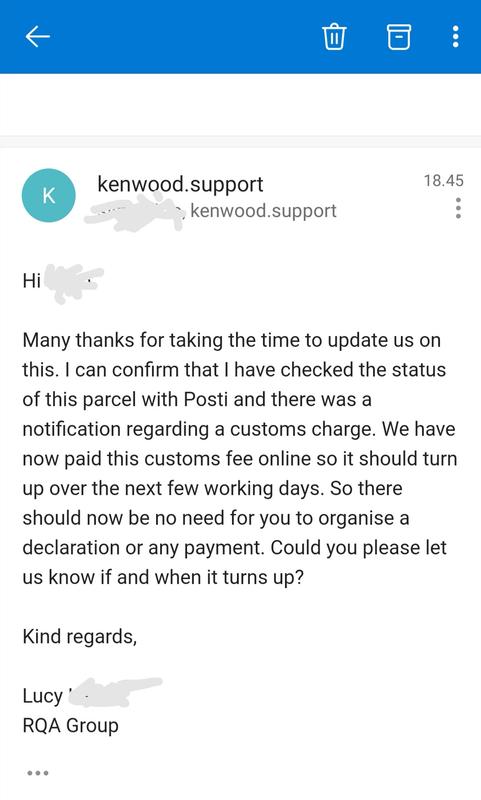Lisäksi täytyy nostaa hattua Kenwoodin asiakaspalvelulle. Pyysivät oma-aloitteisesti tarkistamaan osan, jossa olivat laadunvalvonnassa havainneet ongelman, ja lähettivät lopulta maksutta uuden tilalle. Lähestyivät uudelleen varmistaakseen onko lähetys tullut perille, ja varaosan jäätyä tullattavaksi hoitivat asian puolestani. Erinomaista palvelua siis!