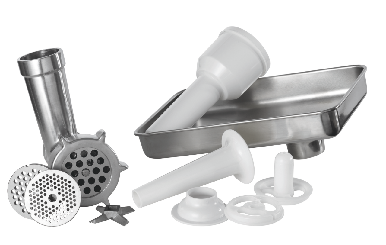 Toinen on syöttöpainin (kuvassa lihakaukalossa) jolla lihoja painetaan myllyyn. Makkara suppilo voisi olla hiukan kapeampi jotta lampaan suolikin mahtuisi suppilon päälle.