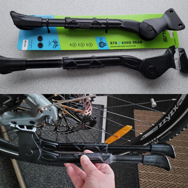 Jämerän tuntuinen ja hyvän näköinen tuki. Helppo kiinnittää takahaarukassa oleviin reikiin, näitä reikiä ei kuitenkaan ole kaikissa pyörissä.