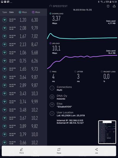 Laite ostettu 22.6.2017 ja mittasin 16.3.2019 mitä antaa metrin päästä ulos, kun Samsung Tabletti vaikutti niin hitaalta.