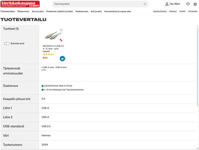 Tuotteen "Tärkeimmät ominaisuudet" osiossa sanotaan että kaapeli on 1m, mutta alempana, "Kaapelin pituus (m)" osiossa lukee että 0,5m. Näkyy helposti tuotteen vertailusivulla: