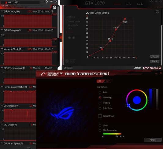 Lataa tietokoneelle GPU Tweak II ja AURA (Graphic card) sovellukset, ensiksi mainittu antaa mahdollisuuden säätää tuulettimien aktivointilämpötiloja sekä muuta. Jälkimmäinen sovellus on yksinomaan kortin ledien valaistuksen muuttamiseen. Tässä kannattaa erottaa sovellus samannimisestä sovelluksesta, joka kuitenkin on vain emolevyn valaistuksen säätämiseen.