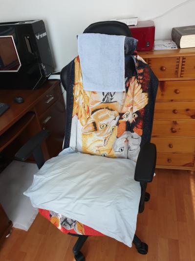 Tosin niskatyyny on hieman liian paksu. Laitoin tilalle ohuemman. Onnistuu tyynyn kuminauhan avulla, kun tyynyn kääntää tuolin taakse ja laittaa ohuemman tyynyn kuminauhan alle istumapuolelle.