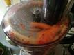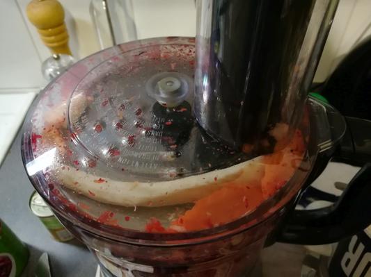 Teholeikkuri toimii ihan asiallisesti, joskin kone tärisee jo tyhjänä erittäin reippaasti. Valitettavasti raastin/leikkuriterän käyttöä ajatellen laite on kuitenkin suunniteltu vähän miten sattuu. Syöttöputken ja leikkuuterän väliin jää niin paljon tilaa, että esimerkiksi normaalipaksuiset porkkanat ja palsternakat lähtevät helposti taipumaan ja sitten pyörimään leikkuriterän päälle (katso kuvat). Siellä sitten hetken aikaa pyörittyään ne muuttuvat tasaisen raasteen sijaan mössöksi. Tai kauniisti viipaloidun sijaan epämääräiseksi silpuksi. Tämän lisäksi esimerkiksi normaalipaksuista kurkkua on turha kuvitella saavansa mahtumaan syöttöputkesta sisään, eikä laite käynnisty ilman putken kiinnittämistä. OBH Nordican kotisivulla olevassa tuotevideossa oli kaksi erilaista raastinterää, tuotteen mukana niitä kuitenkin tuli vain yksi: karkea raaste toisella ja viipalointi toisella puolella, joista molemmat valitettavasti siis tekevät huonoa jälkeä. Tulos kelpaa ehkä lähinnä keittoihin ja pataruokiin käytettäväksi. Halvalla ei taaskaan saanut hyvää.
