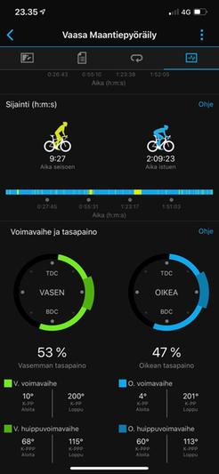 Istuen/seisten tietoa ei ole, eikä voimavaihetta. Ao. tiedot löytyvät; käytössä Garmin Connect ja Edge 1030.
