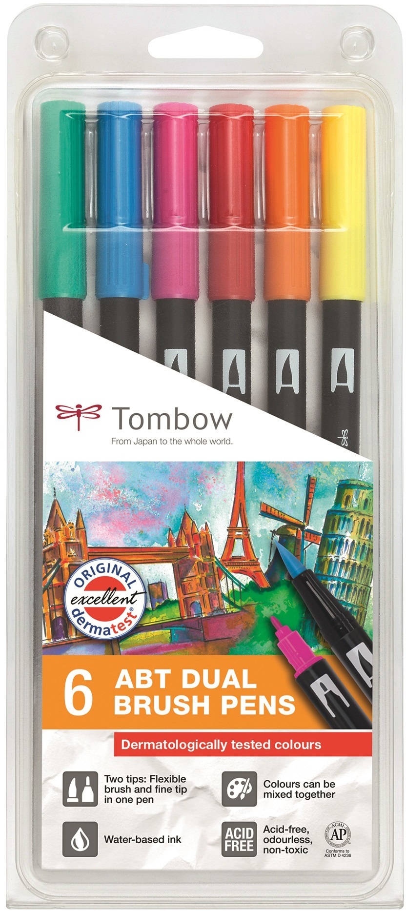 Tombow ABT Dual Brush 6P-3 -vesiväritussit, 6 kpl, perusvärit