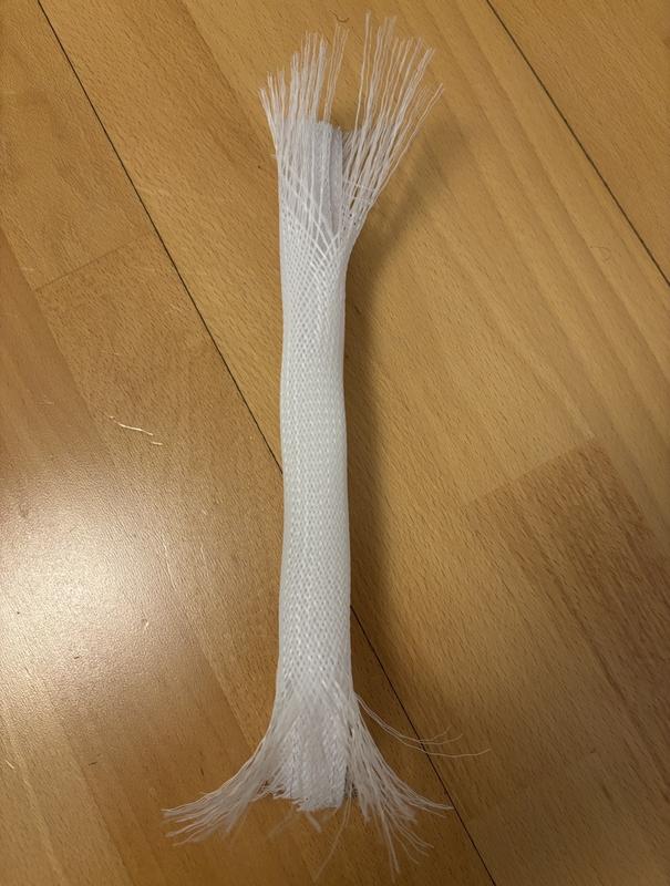 Mahtuu yllättävän monta johtoa kun materiaali venyy jonkin verran. Johtojen vaihto vähän hankala kun menevän takkuun. Lyhennys onnistui saksilla. Materiaali meinasi alkaa purkautumaan leikkauskohdasta, mutta sytkärillä vähän sulattamalla materiaalia purkautuminen estyi.