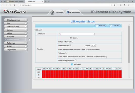 AsentajaässäM, 45–54vOpticam O6 PoE -kamerassa ei ole passiivista infrapunatunnistinta, joten kaikki liikkeentunnistus tehdään kuvassa tapahtuvasta liikkeestä (pikselit). Puut, pensaat yms. ovat ongelmallisia ja varmasti kamera lähettää ainakin välillä virhetunnistuksia. Liikkeentunnistimen asetuksista (VMS-sovellus) kannattaa rajata tunnistusaluetta (detection area) ja tarvittaessa sijoittaa kamera ’parempaan’ paikkaan. Myös tunnistuksen herkkyyttä kannattaa säätää ja sitten testaa asetuksien toimivuutta.