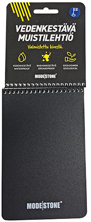 Tekee juuri sen mitä luvattiin eli kestää vettä ja voi kirjoittaa märässä lyijärillä. Vähän hintava on mutta tiiviisti kun kirjoittaa niin kestää kyllä pitkään. Suosittelen kaikille varusmiesjohtajille.