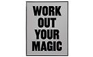 Pieni seinälle kiinnitettävä peili, jossa voimalause aamuihin, tässä peilissä: Work out your own magic. Peilissä on kapea metallinen reunus ja tekstit mustalla.