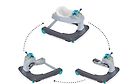 Helppo kasata ja muuttaa. Liikkuu huonosti, etupyörät kääntyvät heikosti ja koska takapyörät eivät käänny on härvelin liikuttaminen hankalaa lapselle. Vain kaksi korkeutta, tarkoitettu melko pienille. Kävelyyn käsille tarkoitettu pitotuki ei siedä paljoa painoa. Leluosa kiva lapsen mielestä mutta kuola pääsee valumaan nappuloiden raoista sisään.