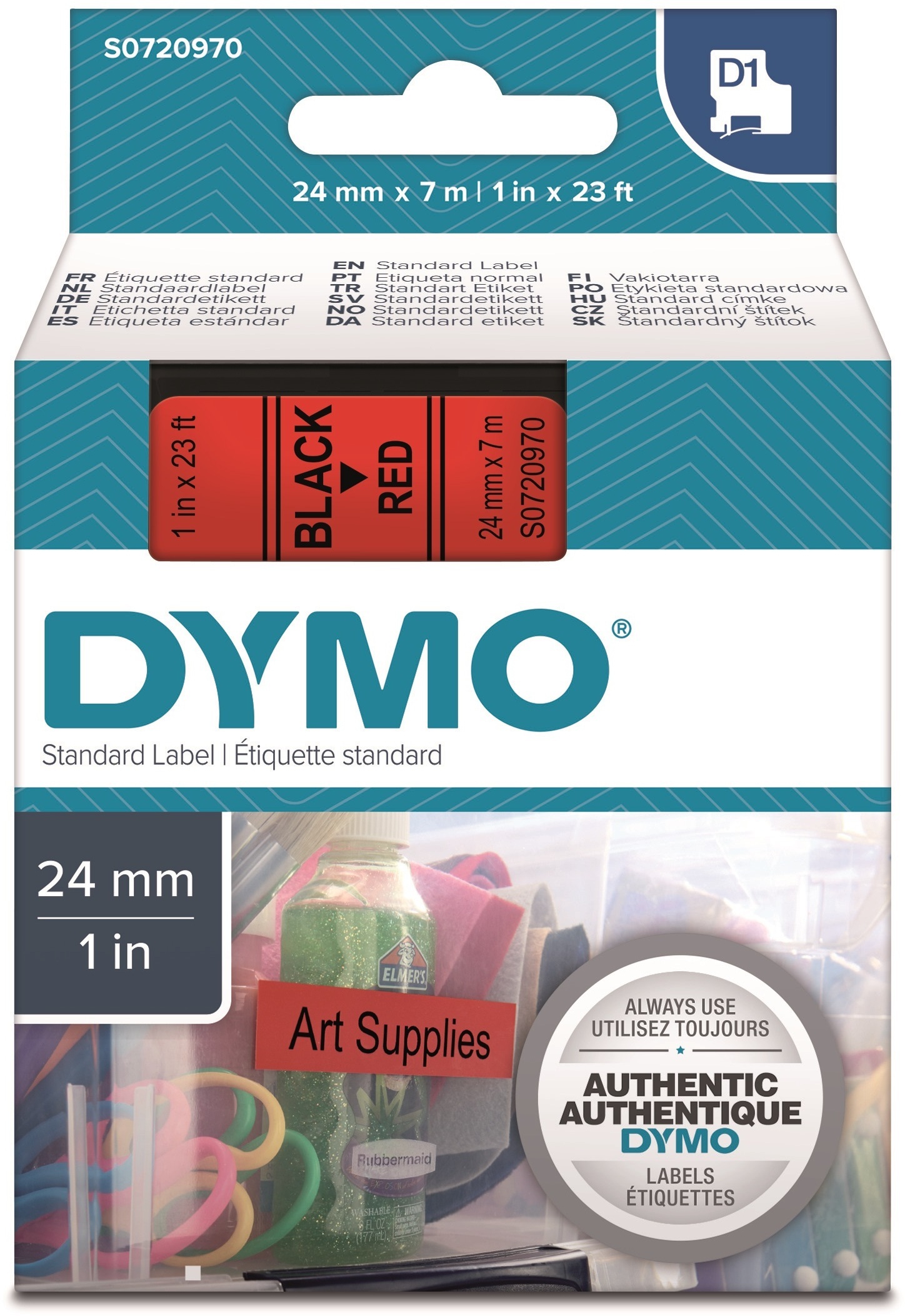 Dymo D1-teippi 24 mm musta punaisella, 7 m