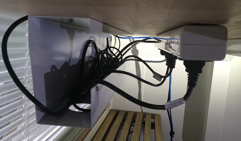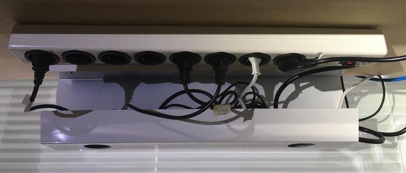 Kiinnitin 8-osaisen ylijännitesuojatun ON/OFF-kytkimellisen jakorasian pöydän kattoon, johtokourun ulkopuollelle, jotta johtojen irroittaminen on mahdollisimman sujuvaa. Näin johtokouruun mahtuu enemmän tilaa johdoille.