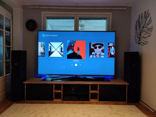 86' telkkaria 195cm leveydellään ja iso keskijalka antoi paljon haasteita TV tasolle varsinkin kun äänimaailma on rakennettu 7.1 tyyliin ja tv:n alle keskelle piti tietysti saada keskikaiutin. Seinäkiinnitys ei meillä ollut mahdollinen koska uusi telkkari jättää taakseen yli 180cm ikkunaa.