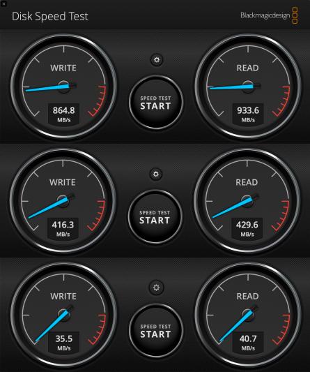 Ollaan lukemissa, jotka ovat hyvin tyypillisiä SSD levyille, jotka käyttävät USB 3.1 protokollaa (tai SATAa käyttävälle SSD:lle). Mikä on tässä tapauksessa nopeuden laskun todellinen syy? En tiedä. Se ei voi olla kumpikaan levy, koska tiedetään niiden pystyvän parempaa. Se voi olla toimitettu kaapeli tai iMacin portti. (Kautta historian USB:n teoreettisilla nopeuksilla on ollut hyvin vähän tekemistä tosielämän nopeuksien kanssa)