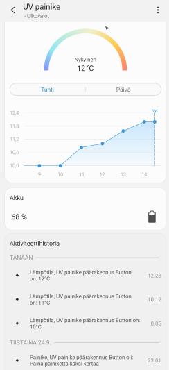 Mukavana lisänä ominaisuus, jota ei erityisesti mainosteta: napissa on myös jatkuva lämpötilan mittaus, joka näkyy Smartthings kännykkäsovelluksessa paitsi sen hetkisenä arvoja, myös historiana.
