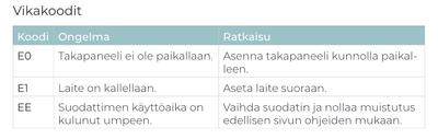 Käyttöohje ei kerro mitään valorenkaan vilkkumisesta sinisenä, etenkään syystä miksi näin tapahtuu. Minun laitteessani oli tämä sama ilmiö, joka katosi, kun laitteen sammutti joksikin aikaa. Suodattimen vaihtotarpeesta indikoi käyttöohjeen mukaan punaisena palava valorengas. Outoa.