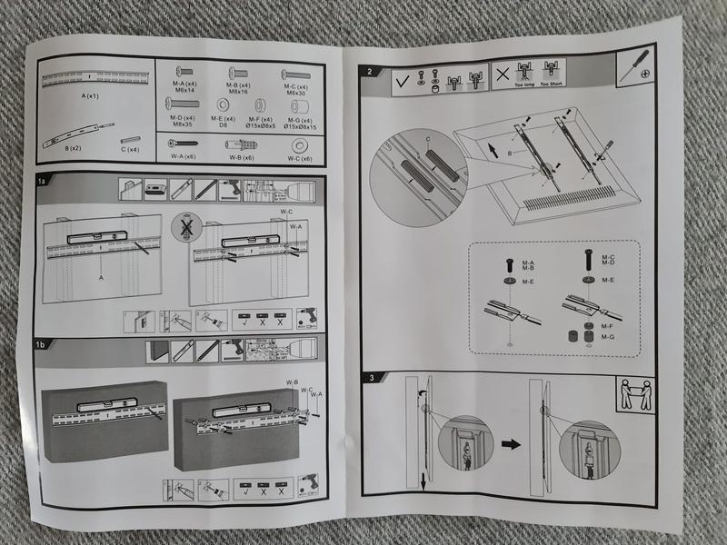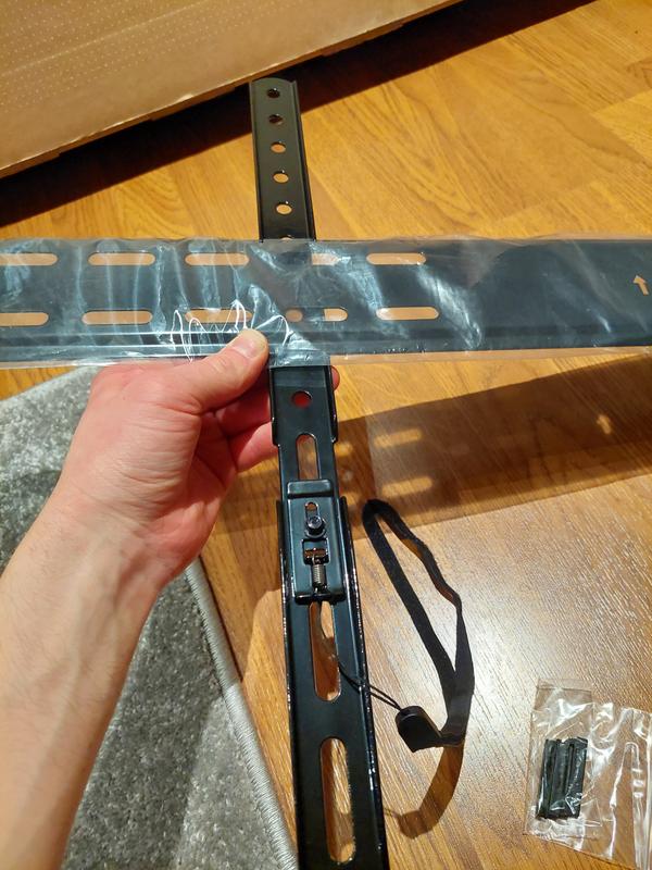 Teline on itsessään tukevaa tekoa, mutta jousikoukut, joilla TV ikään kuin lukittuu paikalleen, hajosivat jo ensimmäisen ripustamisen yhteydessä. Todella heppoisat ja epämääräiset. Mutta ei se mitään, kyllä TV pysyy yläkoukkujen avulla ripustettunakin hyvin paikoillaan. Kiinnitin seinään 75-tuumaisen television, jolla on painoa noin 30kg, joten aika kova tuuli saa käydä, että lähtee paikoiltaan. Pakkauksessa oli todella hyvin kiinnitysruuveja mukana eri kokoisille televisioille. Seinäkiinnitystä varten mukana tuli kiviseinäkiinnitykseen soveltuvat tulpat. Hyvin tuntuu pysyvän, ja kiinnityshiluja jäi paljon yli. Kerrankin näin.