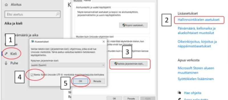 Tähän löytyi korjaukseksi laittaa W10 kieliasetuksissa rasti kohtaan "Beta käytä Unicode UTF-8 merkistöä maailmanlaajuista kielitukea varten,"