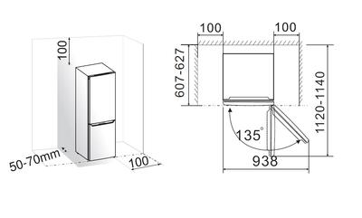 Suositus: On suositeltavaa jättää 50-70 mm väliä laitteen takaseinästä seinään, ainakin 100 mm sen yläpuolelle, ainakin 100 mm sen sivulta seinään ja eteen riittävä tila, jotta ovet aukeavat 135°.