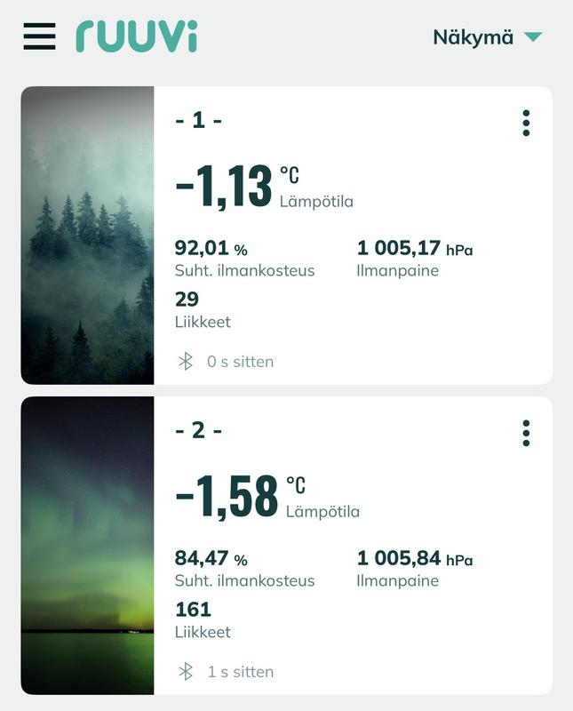 Ruuvitagit toimivat juuri kuten pitääkin. Näitä löytyy jo omasta kodista ja pihalta kymmenkunta. Sovelluksesta näkee sujuvasti kaikkien mittareiden tiedot nopealla vilkaisulla.