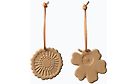 Marimekon Holiday -joulukoristeet on valmistettu lasittamattomasta ruskeasta keramiikasta ja siinä on nahkaripustin. Pakkauksessa on kaksi koristetta, toisessa kolmiulotteinen Unikko-kuosin kukka ja toisessa Siirtolapuutarja-kuosin kukka. Taustapuolelle on painettu Marimekko-logo.