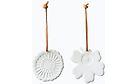 Marimekon Holiday -joulukoristeet on valmistettu lasittamattomasta ruskeasta keramiikasta ja siinä on nahkaripustin. Pakkauksessa on kaksi koristetta, toisessa kolmiulotteinen Unikko-kuosin kukka ja toisessa Siirtolapuutarja-kuosin kukka. Taustapuolelle on painettu Marimekko-logo.
