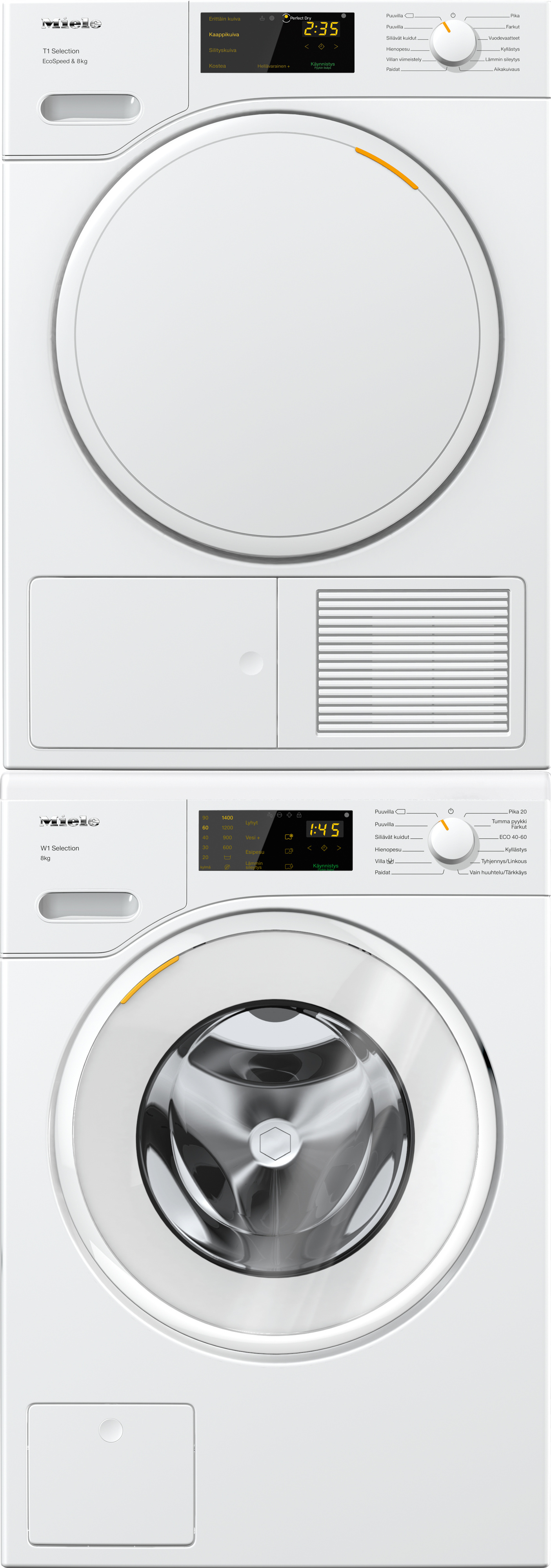Miele WSD 123 WCS -pyykinpesukone ja TSD 443 WP -lämpöpumppukuivausrumpu