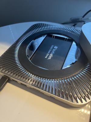 Valmistajan sivuilta löytyvästä käyttöohjeessa ei mainita mitään laajennuspaikkaa SSD-levylle. Väri vastaa Applen tähtiharmaata, eli on tummempi kuin kyseinen Mac Mini.