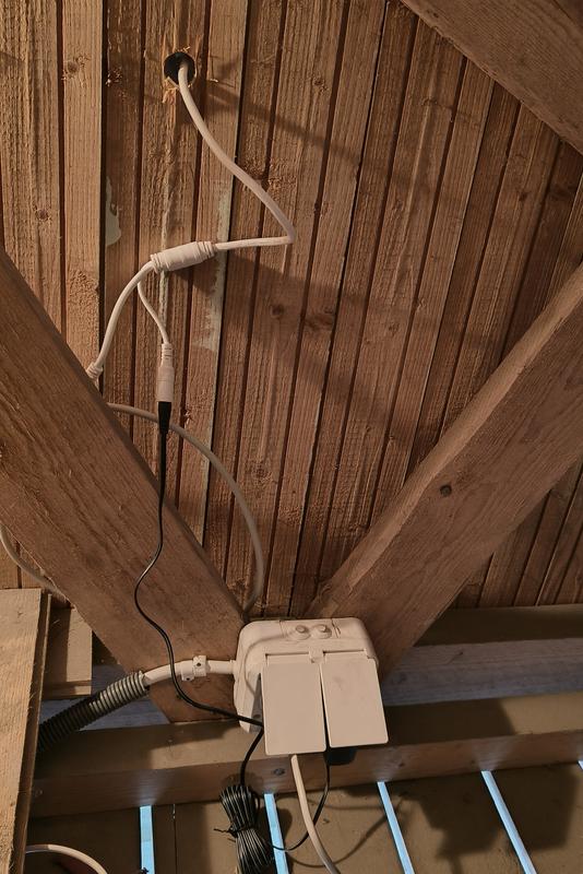 Asentaminen on helppoa ja poraamalla 20 mm reiän autokatoksen seinään sai johdot kokonaan piiloon toiselle puolelle.