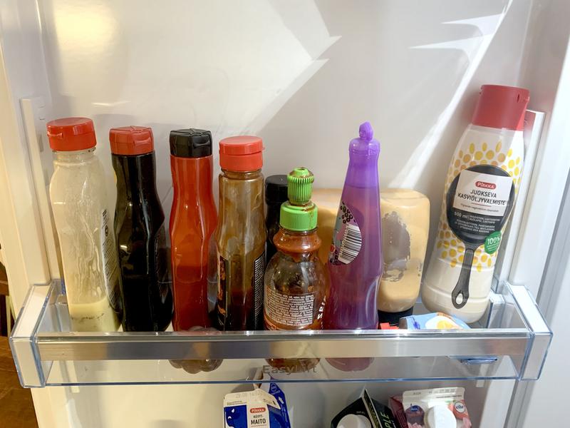 Jääkaapissa on yksi säädettävä hylly ovessa. Jostain syystä sen reunat ovat kuitenkin hyvin matalat, joten helposti kun sitä liikuttaa, yhtään korkeammat esineet voivat kellahtaa siitä pois (kts. kuva). Tai ylipäänsä silloin, jos oven avaa yhtään reippaammin.