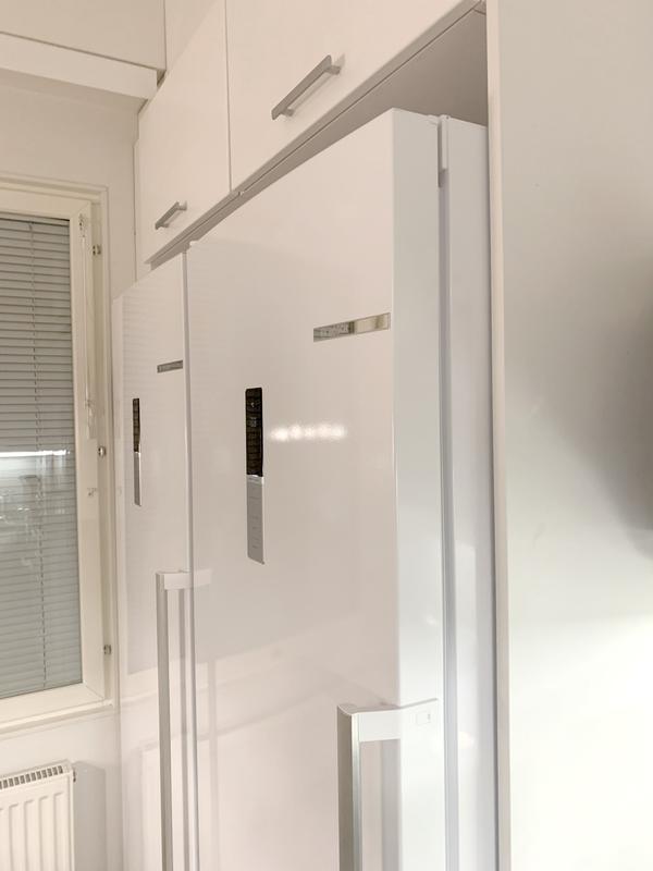 Ensimmäisenä uusia laitteita etsiessä huomio kiinnittyi siihen, että ainakin kaikkien uusien Bosch-kylmälaitteiden tilavuus oli pienempi kuin aiemmin. Jääkaapissa tilavuus pieneni 9 litraa aiemmasta (355l -> 346l). Se tuntui isolta erityisesti siksi, että samaan aikaan kaapin korkeus kasvoi sentillä ja syvyys peräti 5 senttiä! Vuotuinen sähkönkulutus laski 152 kWh -> 116 kWh. Prosentuaalisesti toki paljon, mutta ennemmin olisin ottanut sen 9 litraa lisätilaa. Lisäksi peräti 65 senttimetrin syvyys tekee sen, että laite tulee kaapistosta aika paljon ulos (kts. kuva). Aiemmin vain ovi oli ulkopuolella. Mitä muita malleja vertailin, niin aika moni tosin näyttää olevan nykyisin tuon saman 65 cm syvä.
