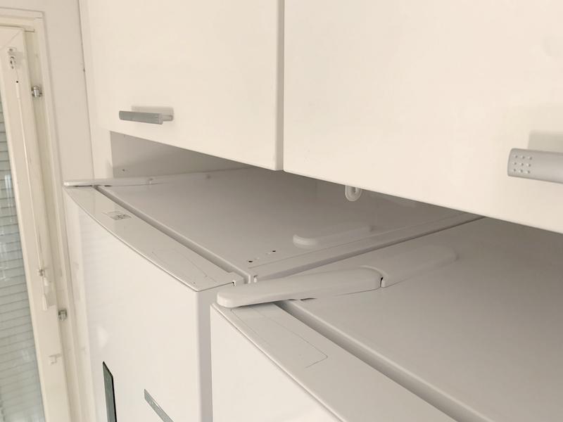 Kaksi laatikkoa joista alempi kiskoilla ovat hyvä parannus. Valoisa ja hyvät ovihyllyt. Lähes äänetön.