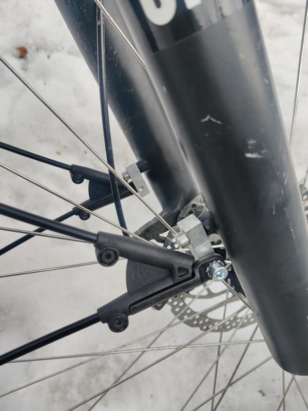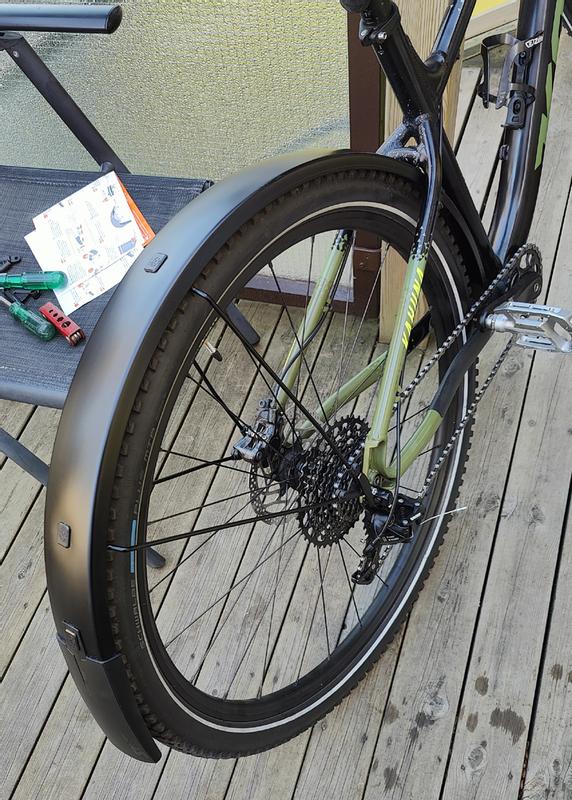 Lokarit on riittävän pitkät. Takalokari tulee kiinni edestä ja kahdella tukiraudalla. Riittää kun lyhentää raudat sopivan pituisiksi. Etulokarin kiinnitys oli haastavampi koska nämä lokarit on ajateltu kiinnitettävän sivulla oleviin ruuvireikiin etuhaarukassa. Itsellä oli kierteet näyttivät taakse niin jouduin jyrsimään alumiinista 90°:n kääntöpalat. Joku toinenkin oli niin tehnyt. Lisäksi toista etulokarin tukirautaa piti taivuttaa lyhentämisen lisäksi, koska etuhaarukan kiinnityspiste on aika kaukana pyörän keskiakselista. Lokari mahtuu just ja just etuhaarukan tukikaaren alta nii, että pyörän (29") ja lokarin väliin jää 10-15mm. Kaikesta pikku säätämistä huolimatta on hyvin toimivat lokarit.