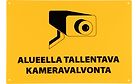 Kyltti, Alueella tallentava kameravalvonta, 30 x 20 cm, keltainen. Isokokoinen ja selkeä muovinen kyltti tallentavasta kameravalvonnasta. Kyltin kulmat ovat rei'itetty, joten kiinnitys on helppo tehdä.