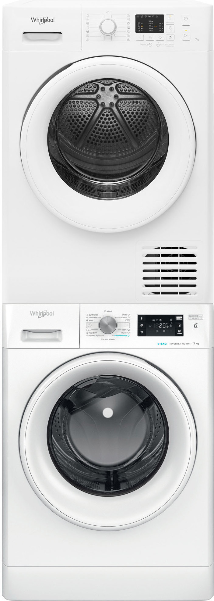 Whirlpool FFB 7438 WV -pyykinpesukone ja Whirlpool FT CM10 7B EU -kuivausrumpu