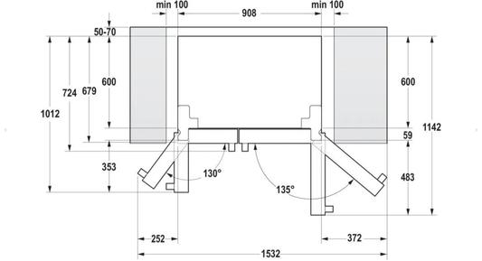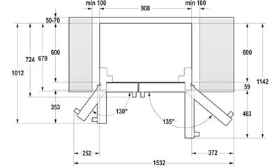 Tiedustelija25–34vJos Gorenje NRS918EMB -Side By Side -kaapin ovet jäävät reilusti syvennyksen (esimerkiksi kalusteisiin/ kaappiin) ulkopuolelle eikä ovien tiellä ole muita kiinteitä esteitä niin tällöin sivuille ei tarvitse jättää 100 mm. Muissa tapauksissa kaappi tarvitsee 1110 mm leveän tilan jotta ovet aukeavat 90°.