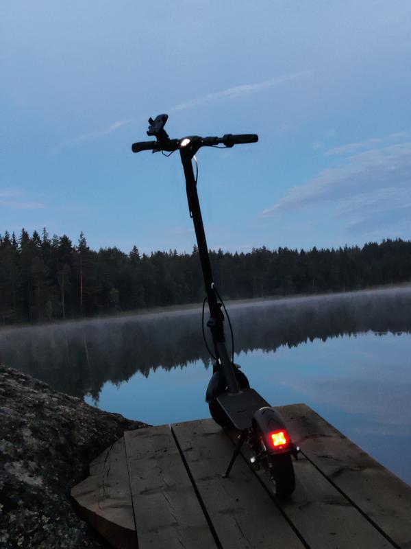 Kolmen viikon ja 150 kilometrin jälkeen täytyy sanoa että oli nappiostos. Kuljetettavuus puolin ja toisin hyvässä suhteessa miehen käytössä. Antaa miellyttävää kyytiä hiekkasimmillakin teillä ja on kestänyt kovempaakin rynkytystä hyvin tähän asti mitä nyt yks mutteri laudan takaoikealta pudonnut mutta oli helposti korvattavissa uudella. Kaasua säästelemättä range ollut 21-25 km luokkaa. Huonoina puolina sovellus joka ei ole löydä skootteria ekalla yrittämällä koskaan (itse en sitä tarvi mihinkään), sekä takajousitus alkoi natista aika pian epätasaisimmilla teillä.