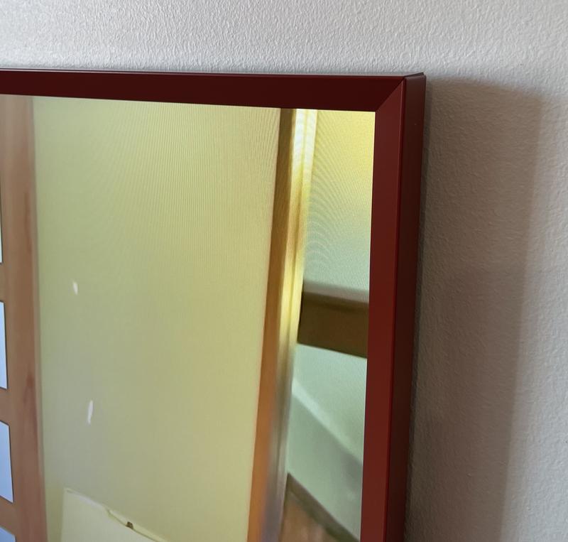Kehyksen väri ja materiaalisuus ei vastaa kuvaa ollenkaan. En tiedä, voiko olla että sain ehkä väärän tuotteen toimitettuna, sillä sen värinimi paketissa ei myöskään ole "terrakotta" vaan "brick red" ja se nimi vastaakin tätä väriä paremmin. Kyseessä on mattamuovinen punaruskea kehys, ei tuollainen metallinhohtoinen poltettu oranssi mitä odotin kuvan pohjalta. Kehys tuntuu myös olevan toiselta reunalta jotenkin millin liian pitkä, en saa molempia kulmia istumaan täydellisesti – jompi kumpi on aina vähän kehnosti. Tämä ei näy kauempaa katsoen, mutta tällä hinnalla ja TV:n hinta ja laatu huomioonottaen odotin täydellistä istuvuutta ja laadukasta materiaalia. Tulen palauttamaan tuotteen.