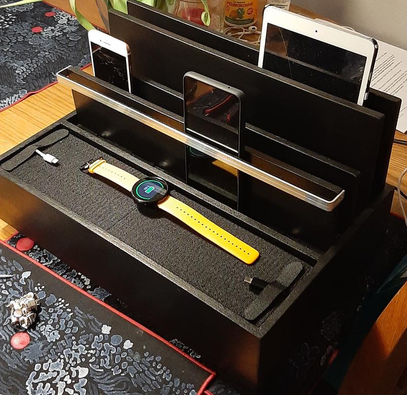Rakensin puusta latauspisteen, kun perheen laitteiden johtohässäkkä muuttui solmuksi. Asensin Ankerin laturin tarranauhalla taakse tarjoilemaan virtaa max. 10 laitteelle. Tähän tarkoitukseen se sopii hyvin. Laite on sopivan pieni 10 USB portin laitteeksi ja mielestäni antaa laadukkaan vaikutelman. Johdot pysyvät napakasti porteissa kiinni, eikä valittamista latauksessakaan ole; mikään laite ei valita alitehoista latausta ainakaan kun 6 laitetta on kiinni. Latausaikoja en ole seurannut. Laitteessa on virtakytkin takana; plussaa tästä, sillä haluan pystyä sammuttamaan lataukset aina kun en ole kotona. Mielestäni siis OK laite.