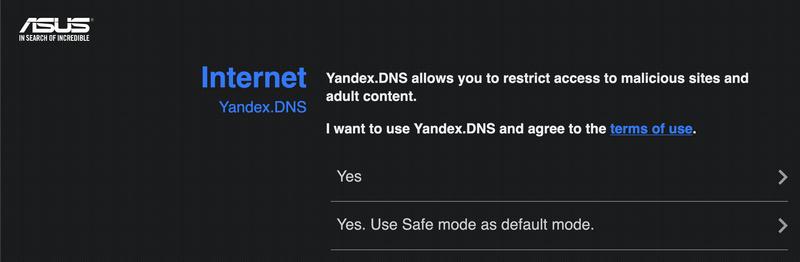 Kun yrität mennä wizardin läpi niin sinun on pakko, toistan pakko, vaihtoehdot ovat "Yes" tai "Yes. Use Safe mode as default mode." käyttää Yandex:in DNS palvelimia. Jos et tiedä mikä Yandex on niin se on on venäjän versio Googlesta, ja se on venäjän valtion hallinnassa oleva yritys.
