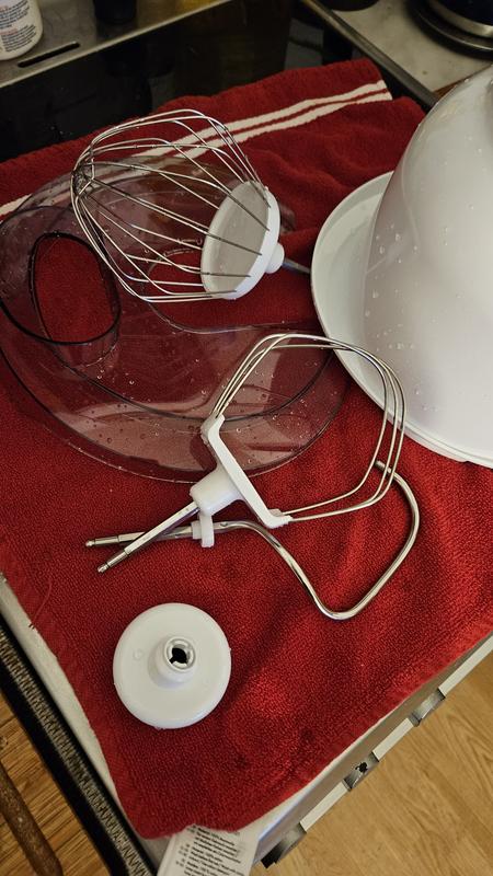 Koneen mukana tuli taikinakulho sekä kolme sekoitusvälinettä: taikinakoukku, vispilä sekä pallovispilä. Olemme nyt kokeilleet pallovispilää, jolla teimme jouluksi sokerikakun ja vatkasimme useampaan kertaan kermaa sekä täytteitä. Vispilällä vatkattiin jouluksi porkkanalaatikon ainekset. Taikinakoukulla kone valmistaa vaikka kuohkean pullataikinan. Sokerikakun teossa huomiona oli, että vispilä valmistaa taikinan niin, ettei jauhoja jää vispaamatta keskeltä tai kulhon yläreunasta eli vispaa koko akulhon alueelta. Kone on hiljainen. Osat ovat konepestäviä. Kerman vatkauksessa siisteyttä edesauttoi suoja/roiskekansi, jonka päällä on erillinen annostelureikä. Aluksi suojakantta oli vaikea laittaa paikalleen, mutta kun sen oppii, niin ei ole huolta. Koska laitteen varsi kääntyy eri asentoihin, sitä voi säilyttää pienemmässä tilassa. Koneeseen saa hankittua lisäosia, joilla tästä saamme kokonaisvaltaisen keittiöapurin Suosittelemme! Taikinoista tuli kuohkeaa ja täydellistä.