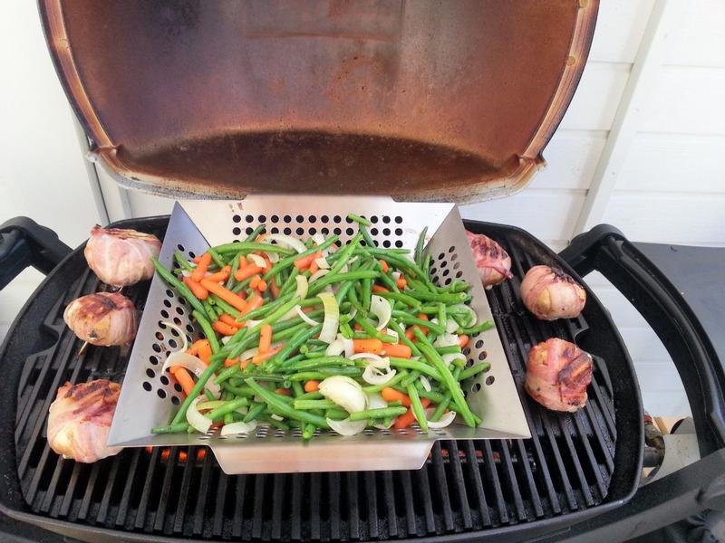Babyporkkanat, sipuli, vihreät pavut, vähän öljyä, suola, pippuri muovipussiin tunniksi. Välillä sekoitetaan pyörittämällä pussia käsissä. Grillauskoriin ja kevyesti ruskistetaan. Herkku on valmis. Lohkoperunat ja uusperunat tuli paistettua samalla tavalla. Astianpesukoneessa pesu ja hinta enemmän kuin kohdalla.