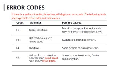 Hei, Mitä virhekoodi E1 tarkoittaa? Kone tyhjentää vedet ja ei suostu pesemään astioita.