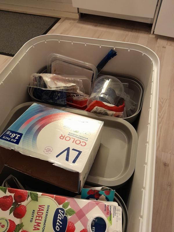 Hyvin toimii lajittelun lisätilana keittiön kolmen astian ohella. Tuntui vähän kalliilta muoviastiaksi, siisti on kuitenkin.