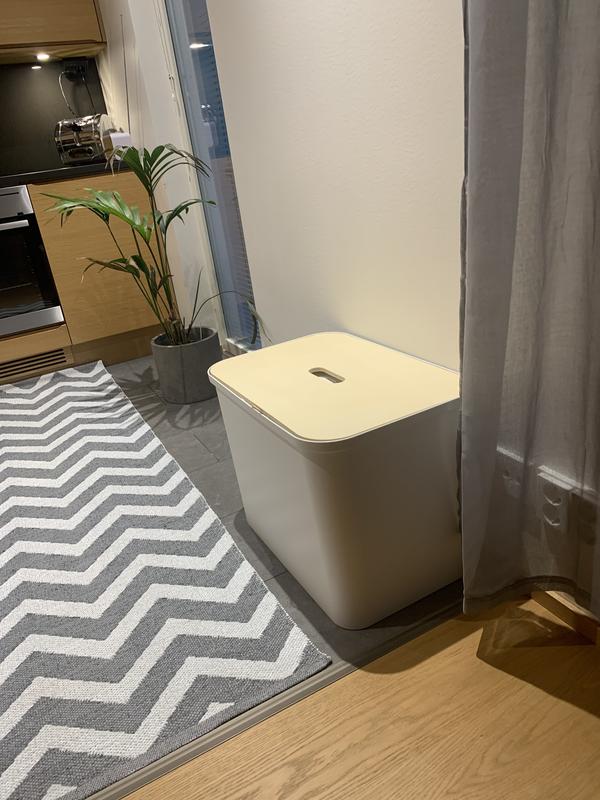 Kestää katseet ja taipuu monenlaiseen säilytykseen. Käytän itse lasi, metalli ja kartonkijätteen kierrätykseen. Myös koiran ruoat sain kätevästi piiloon kannen alle. Helppo pitää puhtaana ja kestää jopa istahtamisen kannen päälle. En luovu tästä ikinä enää. Voin suositella👍